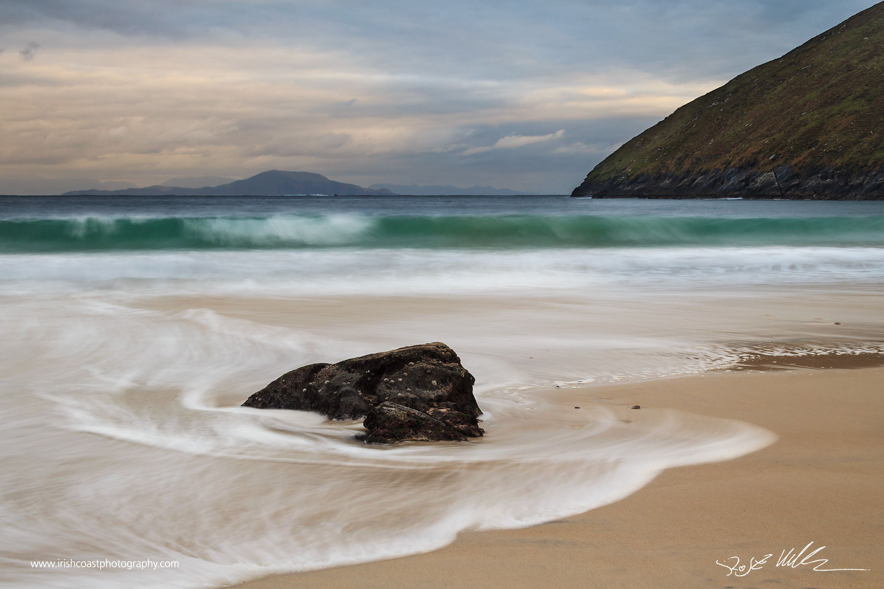 For the last week or two we have had a funny weather pattern where the sun comes out about an hour before sunset, teasing me to quickly find a good viewpoint, but then thick clouds are rolling in to block it out before the sun dips below the horizon. I made this photo during the week on the beach of Keem Bay, Achill.